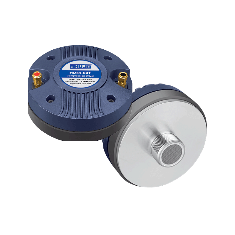 Professional compression driver HD44-60T, suitable for high power speakers. It features TITANIUM diaphragm round aluminium wire voice coil and strontium ferrite magnet for high SPL & superb HF response. With a suitable horn it is ideal for use with low frequency speakers AHUJA L12-MB300, L12-MB400, L15-MB300,